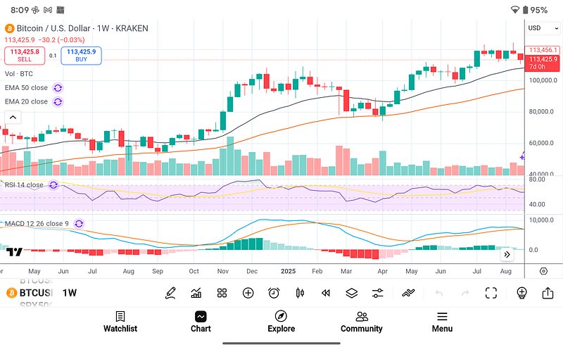 Bitcoin trades at $113,600, consolidating just below its all-time high of $124,400 set on August 13, 2025. The weekly chart shows BTC holding above the 20-week EMA ($105K) and the 50-week EMA ($92K), confirming an intact bullish structure.