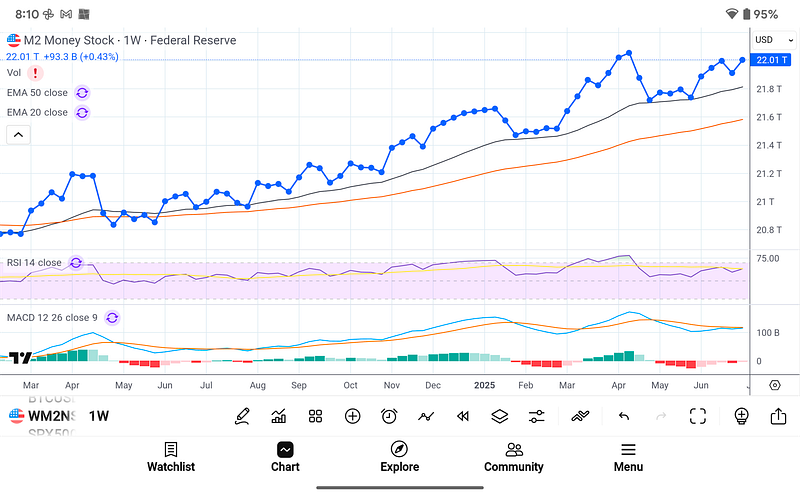 The M2 Money Supply has reached $22.01T, expanding by over $93B week-over-week. Both the 20-week and 50-week EMA trends remain strongly positive, showing that systemic liquidity expansion continues. Historically, periods of sharp monetary growth—such as 2020–2021—aligned with Bitcoin’s most powerful bull runs.