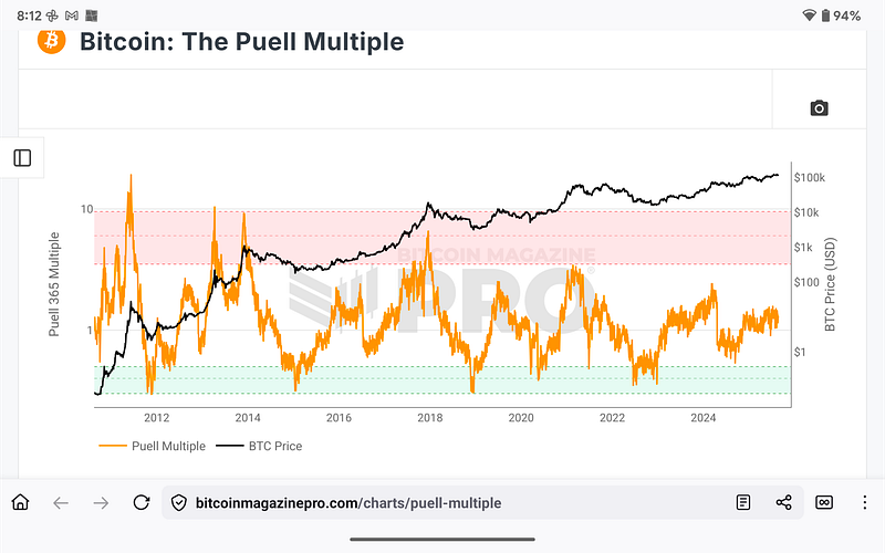 The Puell Multiple tracks miner revenue relative to its one-year average. Historically, spikes into the red zone above 4–6 signaled miners distributing heavily into overheated markets, while deep drops into the green zone marked miner capitulation at bottoms.