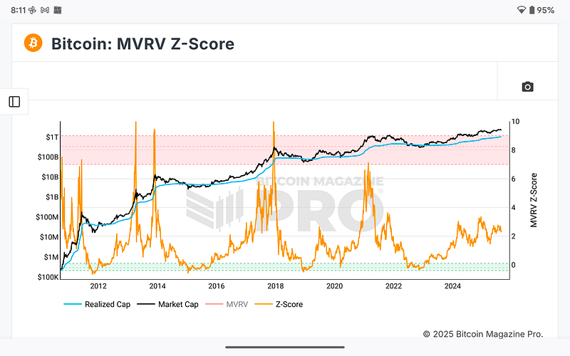 The MVRV Z-Score reinforces this view. Extreme highs above 7–8 have always signaled tops (2013, 2017, 2021), while lows near 0 marked cycle bottoms. Current Z-score levels remain mid-range, far from overheated territory.