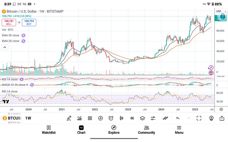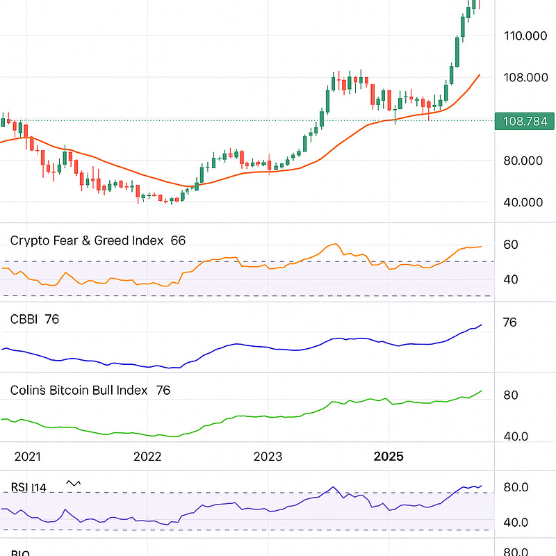 Bitcoin has decisively entered the late-stage bull cycle compression band. As of this writing, BTC trades near $108,800, structurally secure above its weekly 20 EMA ($93K) and accelerating away from its 50 EMA ($77K). The chart looks textbook bullish, with price consistently building atop rising support levels and volatility expanding in the direction of the trend. But while this phase invites optimism, history urges discipline. This stage is the Acceleration Phase—the period in every major cycle where price begins to outpace realized value, sentiment starts climbing into greed, and bullish narratives dominate airwaves. It’s powerful—but it’s not infinite.