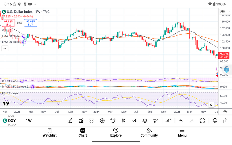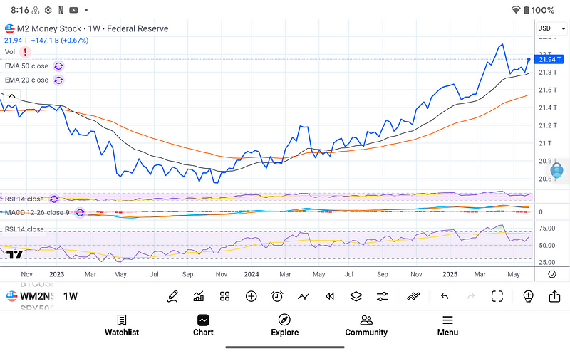 This week’s weekly candle closed decisively above the 20-week EMA, but the true fuel comes from the macro backdrop. U.S. M2 Money Stock just recaptured its 50-week EMA at $21.94 trillion, reversing an 18-month downtrend. Simultaneously, the U.S. Dollar Index fell below its 50-week EMA at 97.8, re-creating the "liquidity up, dollar down" combination that initiated every significant Bitcoin rally in 2012, 2015, and 2020.