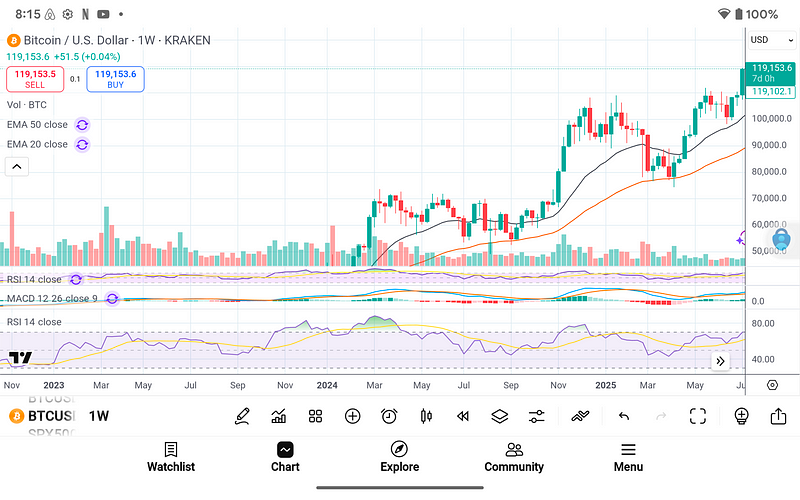 Bitcoin cleared $119k this week, closing above a steep bull-flag pattern with expanding volume and RSI surging back into the 70s. Classic bull-flag anatomy: a sharp rally → consolidation in a tight channel → high-volume breakout.