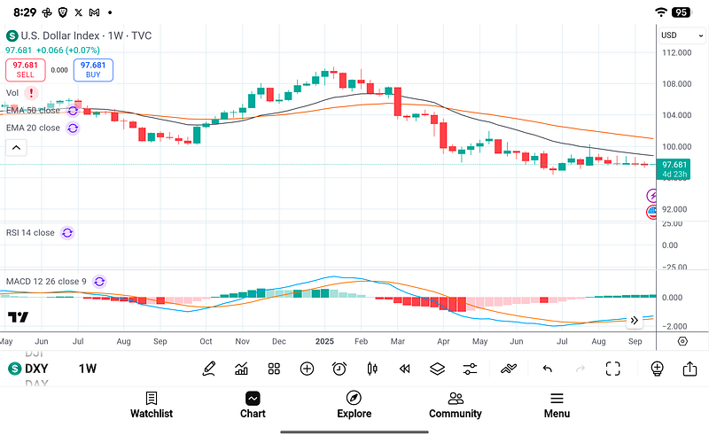 The macroeconomic picture remains supportive of further Bitcoin price appreciation. The U.S. Dollar Index (DXY) has formed a multi-month descending wedge and currently trades at 97.681. A bearish break here would represent a major tailwind for BTC-denominated assets.