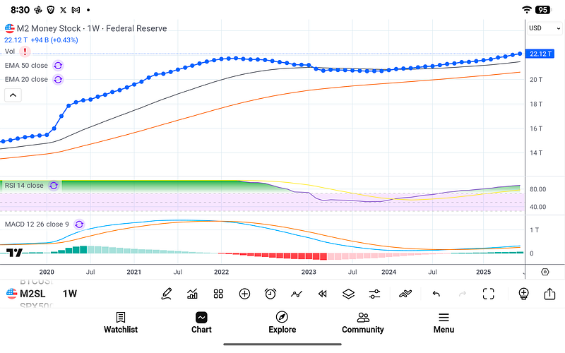 Money supply is also expanding again. M2 is now $22.12 trillion, with a weekly increase of $94.6 billion, suggesting liquidity is slowly returning—a condition historically correlated with upward pressure on Bitcoin price and asset markets generally.