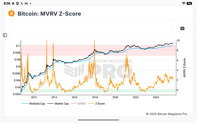 The MVRV Z-Score remains well below its danger zone. Historically, blow-off tops occur when this metric crosses into the red band (~Z > 7.0). We are currently closer to 2.5–3.0.