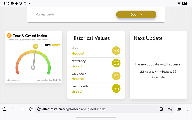 The Fear & Greed Index has recovered to 53, a neutral zone that aligns with the current consolidation period.