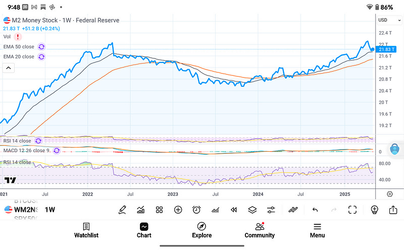 The M2 money supply sits at $21.83T, exhibiting a resumed expansionary trend after its prior contraction phase in 2022–2023. The 20- and 50-week EMAs have turned up, showing rising liquidity conditions once again—a critical tailwind for risk assets and hard money hedges like Bitcoin.