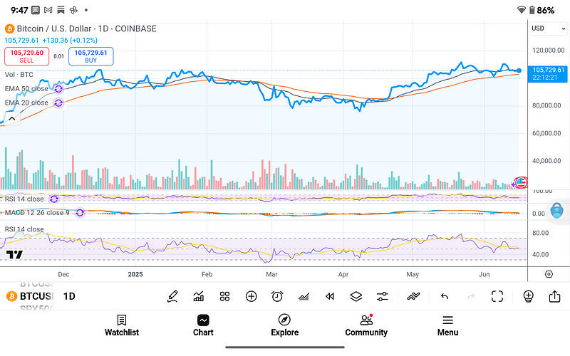 The daily chart confirms a period of volatility compression, with price trading sideways between ~$102,000 and ~$106,000 over the past 10 days. RSI is resetting near 50–55 levels, indicating that momentum has cooled short-term but remains structurally bullish. Volume has been declining, signaling potential for a volatility expansion event ahead.
