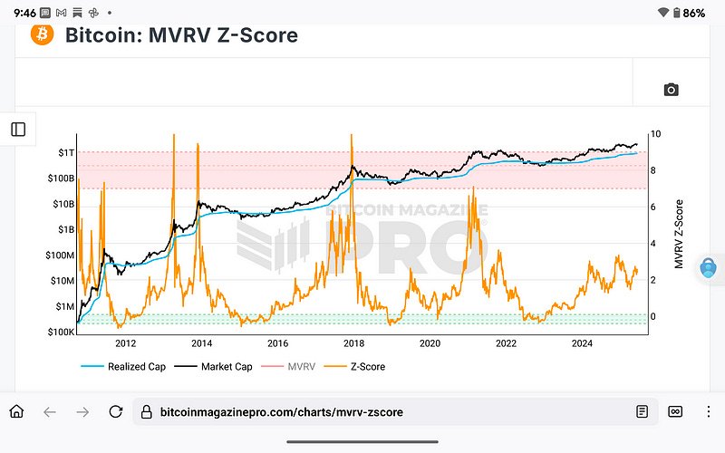 As of this week, the MVRV Z-Score sits between 2.5 and 2.5–3.0, well below the historical red zone (7–10) that often precedes major cycle tops. This suggests Bitcoin is not overvalued on a long-term basis.