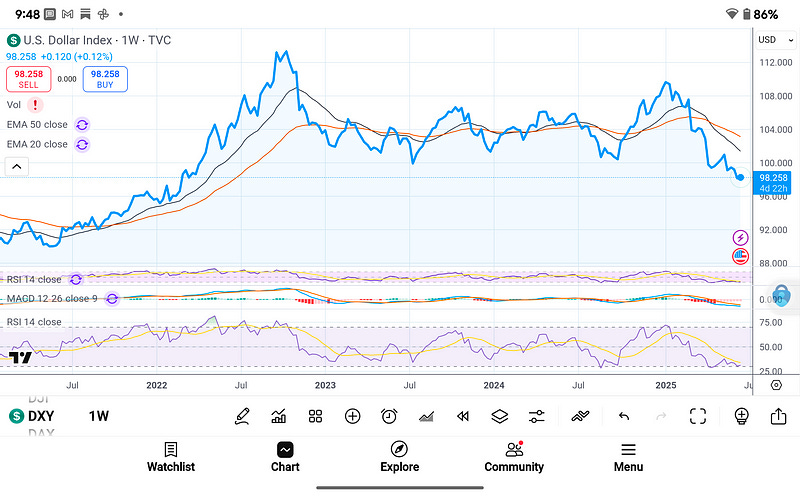 DXY has broken below the 100 level, with the current price at 98.13. It’s trading beneath both 20-week and 50-week EMAs, continuing a long-term downtrend that started in late 2023. The RSI has fallen into bearish territory (below 40), and the MACD indicator shows accelerating downside momentum.