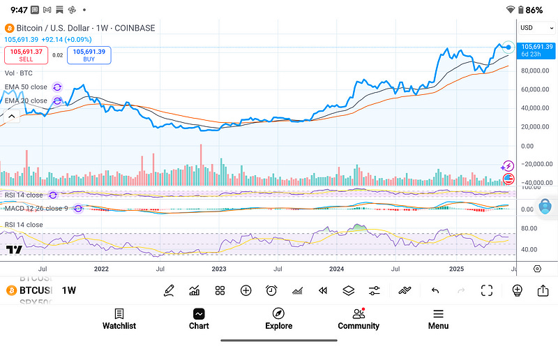 BTC/USD Price (Weekly Close Reference): ~$105,200 (Coinbase)