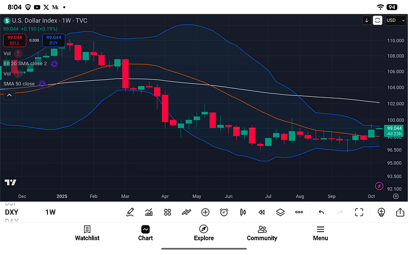 DXY continues to struggle below its declining 50-week moving average and mid-band indicator. A capped dollar historically loosens BTC upside; only a decisive DXY band expansion up would become a real headwind.