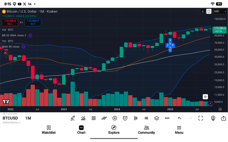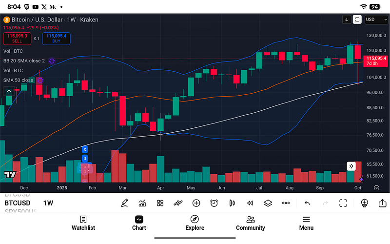 Market structure: BTC is holding the weekly mid-band with higher lows above the SMA-20 and well above the SMA-50, signaling trend continuation after a volatility squeeze.
