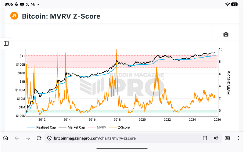 MVRV-Z sits mid-zone, well below the historical euphoria band seen near cycle peaks. That suggests valuation headroom for another drive.