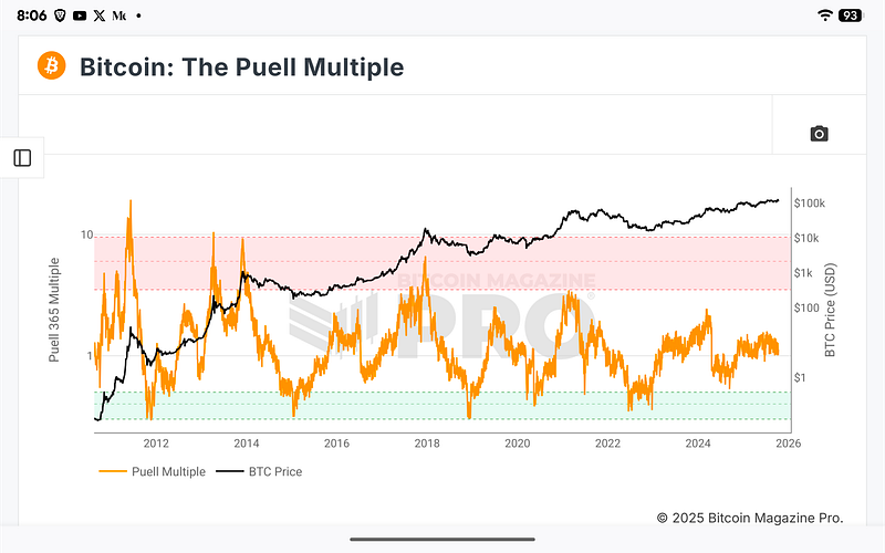 2013/2017: Major tops aligned with MVRV-Z in euphoric territory and Puell moving through the red overheat band — we’re not there yet.