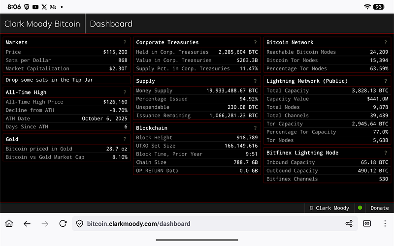 Clark Moody shows: issued supply ≈ 95%, UTXO set >166M (broad distribution), Lightning capacity ~3.8k BTC across ~9.8k nodes and ~39k channels — steady L2 scaffolding for payments throughput.