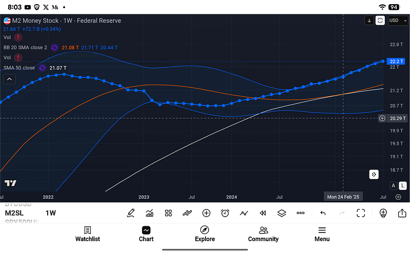M2’s gentle upslope toward the low-$22T region supports rising realized cap. Not a QE-style surge—just steady fuel that lowers the hurdle rate for new highs.